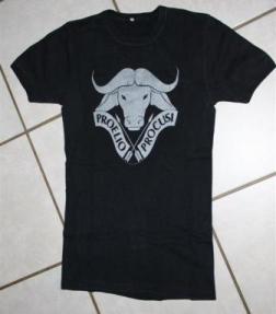 1977 or 1978 (12 week camp) I again reported at Lords grounds and the entire unit of about 300 strong spent the nigh trying to sleep on the hard wooden floor. shortly before dawn we were woken up and had to board waiting Bedfords. Once aboard we were escorted by the military police with wailing sirens we sped through Durban waking every sleeping mortal being. On arrival at the airport we waiting sitting on the tarmac for over 2 hours before boarding one of several Hercules C130s. No problem to me and three others who had already started playing bridge, a game I learnt while wasting my time at university. On landing at Grootfontein 5 hours later we were transported on a Magirus Deutzes several kilometers further north to the Caprivi strip to a camp named Buffalo on the banks of the Okovango river. Here our little group of 10 sappers were attached to the notorious 32 battalion We had to swear to secrecy and not to tell anyone a thing of what we saw while attached to the battalion. Nor were we able to take anything that would show anyone of the battalions existence. I did however manage to smuggle out a t-shirt seen on the left which I gave to my son with strict instruction not to display it in public. |
