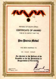 For serving on the border operational areas I was awarded a Pro Patria service medal. I cannot recall any award ceremony so the medal and certificate made out to Cpl Willem Hofland must of just simply arrived in the post. |