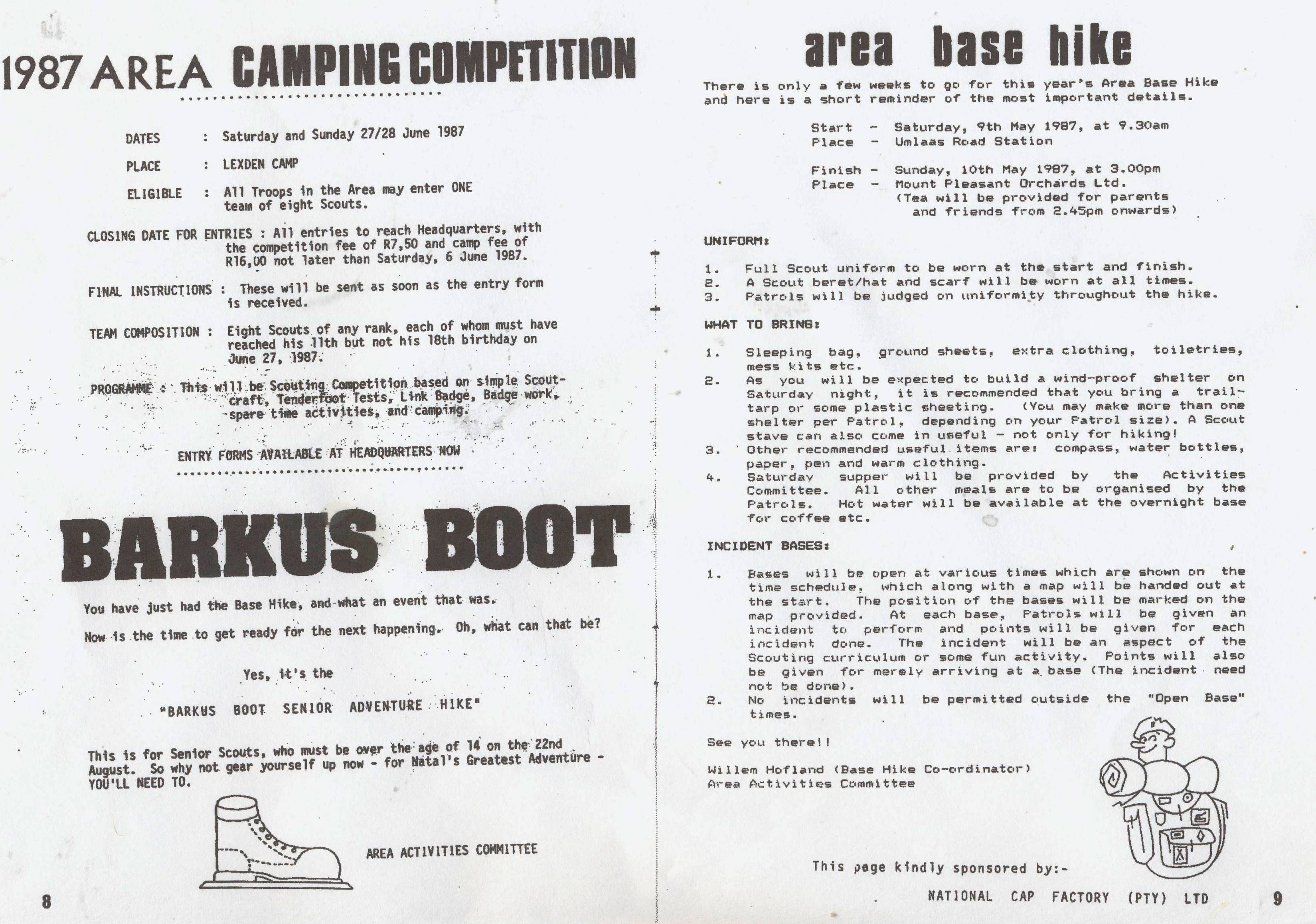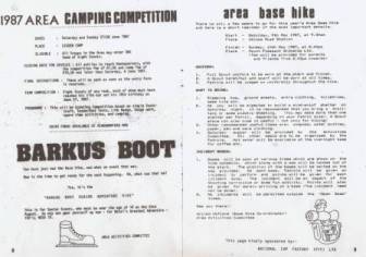 The role of the activities committee was to arrange and facilitate various Area events such as the area Base Hike, area camping competition, area gala and Barkus boot senior adventure hike. Extract of the May 1987 edition of ' The Trail' |
